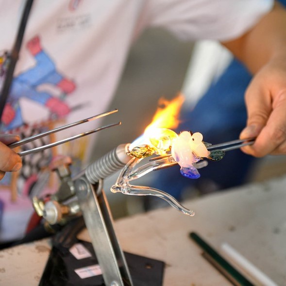 The Flameworking workshop at BGC Glass Studio offers a comprehensive exploration of the intricate art of glassworking utilizing a torch. Participants will acquire foundational skills in manipulating small glass rods, enabling them to craft exquisite jewelry or miniature sculptures.